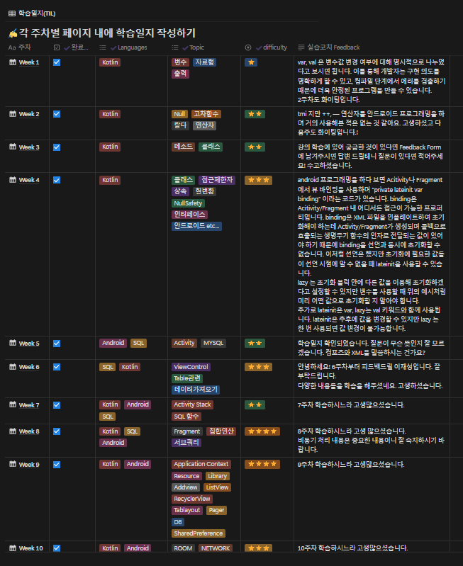 사실 강의만 듣는다면 그냥 무책임하게 틀어놓아도 되었다. (그러면 안되지만) 강의를 듣고 해당 부분에 대해서 무엇을 배웠고, 어려웠고, 궁금한 점이 생겼는지에 대해서 노션에 작성해야 되었다.
