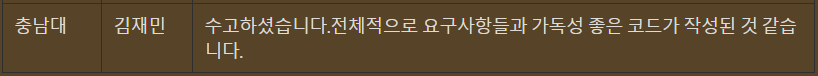 아쉽게도 그렇게 좋은 피드백을 받지는 못했다. 피드백을 받고 느낀 점은, 내가 코딩을 너무 막 하고 있었구나와 코딩에도 규칙이 굉장히 많다는 것을 느꼈다.