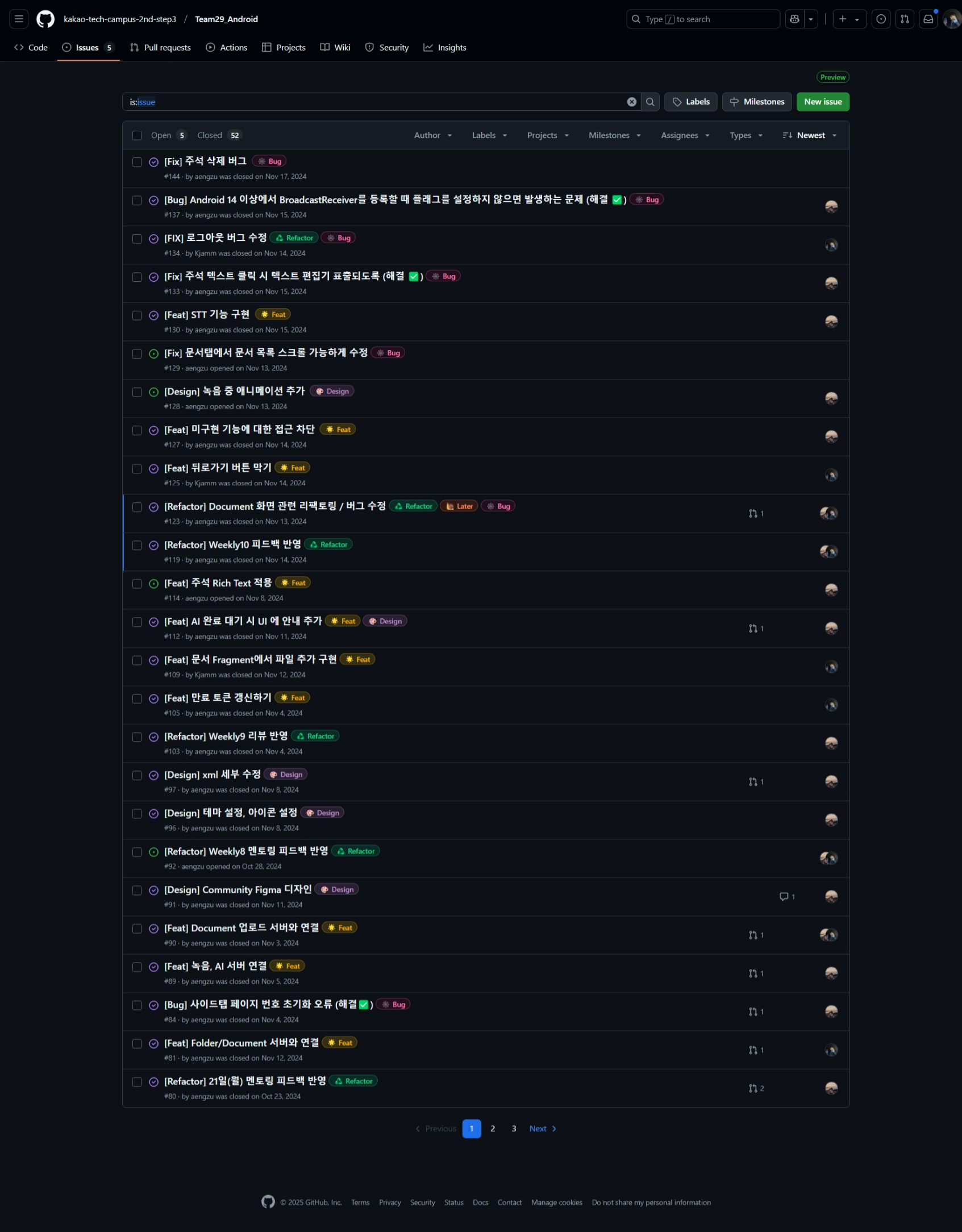 Issue 단위로 PR을 날려 서로에게 코드 리뷰를 해주어 코드를 더욱 더 보완했다. 인원이 적어서 엄청 힘들었지만, 또 인원이 없어서 서로 오히려 자주 회의하고, 바로바로 보완할 수도 있었던 것 같다.